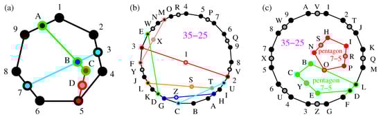 We might try to construct a symmetric MMPH, for example, the 16–13 one given in Figure 3d. For it we obtain  and , that is, again . However, the main problem with such constructed MMPHs is that the probability of coming across their filled (full scale) versions with coordinatizations and therefore belonging to the 3-dim Hilbert space is minute, that is, negligible even via automated construction and search on a supercomputer. The full scale version (23–13) of the aforementioned 16–13 apparently does not have a coordinatization either.