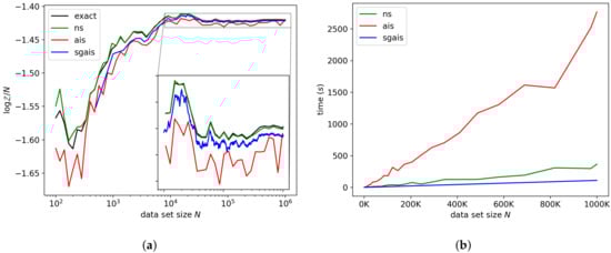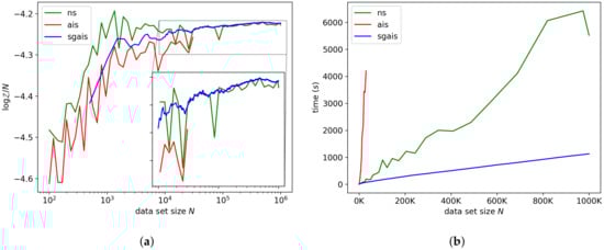Figure 3a,b shows the log-ML estimates and run-time of each algorithm for the logistic regression model. For the largest data set, NS and SGAIS produced estimates that differed by roughly 0.6%, which is negligible. SGAIS was a factor 10.4 faster than the nested sampler on one million observations for this model.