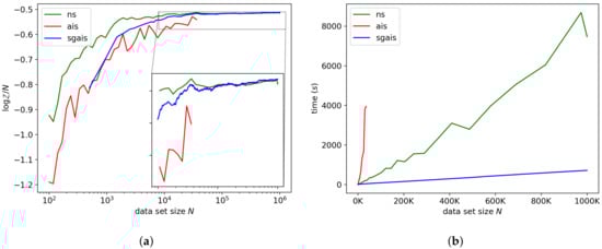 Figure 4a,b shows the log-ML estimates and run-time of each algorithm for the Gaussian mixture model. The posterior distribution for this model is multimodal. Some modes are due to permutation symmetries; these modes do not have to be explored since each one contains the same information. There are also some local modes that do not necessarily capture meaningful information about the data; for example, fitting a single Gaussian to the whole data set may be a poor local optimum of the likelihood function. If an MCMC walker finds one of these modes, it can get trapped. However, we find that by Bayesian updating and annealing, the MCMC walkers tend to leave the poor local modes early on, before they become extremely peaked. The estimates produced by NS and SGAIS differed on the largest data set by roughly 0.1%. For this model, SGAIS was about a factor of 4.9 faster than the nested sampler for one million observations.