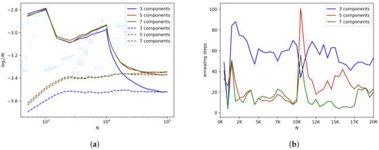 The log-ML estimates shown in Figure 5a display sharp changes at 1000 and 10,000 observations for the non-shuffled data. We are very clearly able to identify the position of the change-points just by looking at the resulting plot, without a priori assuming the existence or number of change-points. The numbers of annealing steps shown in Figure 5b exhibit spikes at the change-points and remain high once more clusters are added to the data than the model can describe.