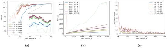 As expected, a higher target ESS tends to result in more annealing steps—see Figure 6a. Most of this work is done in the early stages of Bayesian updating. Note that since we used 10 particles, a target ESS of requires no annealing steps because ESS is bounded below by 1. No annealing results in high variance during the early stages of Bayesian updating, and adaptively annealing helps to reduce that variance, with only a small impact on the run-time. This illustrates the importance of the adaptive annealing schedule in our approach. Figure 6a,b indicates that our approach converges to the log-ML within acceptable accuracy within a reasonable time for a target ESS larger than 1. Even a small target ESS was good enough to match vanilla AIS, on average.