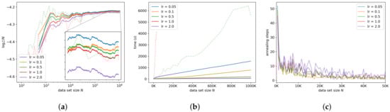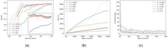 The computational efficiency of using this approach depends on the method of approximating Equation (1). In previous work [], we proposed the estimator , where each is drawn from the posterior distribution using MCMC methods. This paper extends this idea by combining Bayesian updating with annealing, which we describe in Section 3. Since samples from the previous posterior, , would generally be available at each step, we expect that only a small number of steps will be needed to accurately sample from the next posterior distribution, . Metropolis–Hastings-based MCMC algorithms would have to iterate over all previous data points in order to calculate the acceptance probability for each Markov transition, and so using them to estimate in this sequential manner would scale at least quadratically in N. The key computational improvement in our approach comprises the use of stochastic gradient-based MCMC algorithms such as the stochastic gradient Hamiltonian Monte Carlo (SGHMC) []. SGHMC utilizes mini-batching, allowing one to efficiently draw samples from the posterior distribution even when n is large. We call this approach stochastic gradient annealed importance sampling (SGAIS).