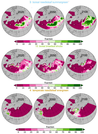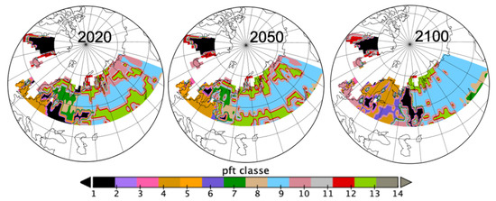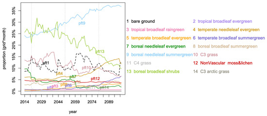 Figure 2 displays the distribution (as proportion of cells over a year) of the dominant pfts. From the year 2025, the already higher spatial proportion of pft9 dominance, boreal needleleaf summergreen, than most pfts, keeps increasing from 25% to almost 40% in 2099 and in the meantime pft13, boreal broadleaf shrubs, decreases from 25% to 10%. From 2039 to 2099, pft10 dominance, C3 grass, halved, while in the meantime pft4 doubles and pft6 increases from 1% to 7%, temperate needleleaf evergreen and temperate broadleaf summergreen respectively. The boreal needleleaf evergreen, pft7, shows a sudden drop in 2059 from 5% to 2%, after a drop of 5% between 2014 and 2025 (halved). In Figure 3, the exact evolution of the proportions of occupation for pft9, pft13, and pft4 are coherent with what has been described, so far, but the information is not quantified.