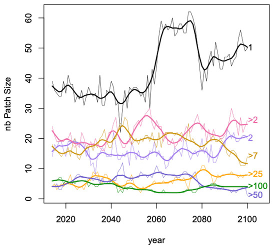 The variation in vertical spread at years 2020, 2050 and 2100 in Figure 5 can be linked to the results in Table 1. Indeed in 2020 the curves can be grouped in three: size 1, sizes 2 to >7 and sizes >25 to sizes >100, in 2050 the spread appears less structured and in 2100, size 1 group is important as the grouping sizes >50 and >100. However, much care is needed here as in Table 1 it is the frequencies of grid cells involved in and only the number of patches in Figure 5.