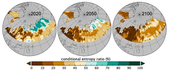 From this table (Table 1) and parts involved in the conditional entropies one can represent spatially the heterogeneity due to spatial sizes that are revealed by the occurring patch sizes per spatial grid. In Figure 6 are geographically mapped the parts contributing to the conditional entropy for C knowing local spatial sizes , i.e., the sum of the for all the sizes . The closer to 0 the more homogeneous the distribution of C is as due to the spatial sizes involved in the local patches. The theoretical maximum heterogeneity is the value given in Table 1 if all sizes were involved, so Figure 6 is mapping the % of that maximum value as indicated in Equation (6). Where there was no patches mapped values are missing and can be interpreted as uniformity in C because of no patches found. Changes in homogeneity given the local spatial patch sizes are quite dramatic and shows more changes than only the dominant pft recorded per spatial grid as in Figure 4. The two figures are indeed complementary. Over the 2020-2100 period, one obverses in Figure 6 a loss of homogeneity given the patch sizes in the Fennoscandia area whilst a slight increase in homogeneity is seen in western and southern east Russia between 2020 and 2050 followed by a slighter decrease at 2100. Northern Russia shows a decrease in homogeneity between 2020 and 2050 followed by an increase at 2100.