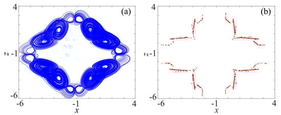 - Escalante-González, R.J.; Campos-Cantón, E. Generation of chaotic attractors without equilibria via piecewise linear systems. Int. J. Mod Phys. C 2016, 28, 1750008. [Google Scholar] [CrossRef]