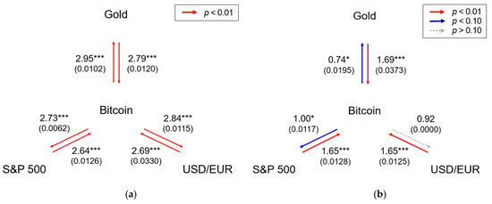 Many studies have used the Granger causality test to measure causal relationships between various time series: price fluctuations in oil and gold markets [35] and contemporaneous effects between stock returns and foreign exchange rates [36]. Earlier studies have identified a causal link of Bitcoin with gold futures [37] and with stock markets, in particular the S&P 500, in major countries [8]. Notably, there is still no empirical evidence about a causal link between Bitcoin and fiat money (e.g., the USD) in commonwealth countries except for a few Asian countries, such as the Thai baht and Taiwan dollar [8,9]. Thus, our results are generally in line with the literature; Bitcoin has a limited causal link only with some investment assets, which is asymmetric, primarily from other assets to Bitcoin.