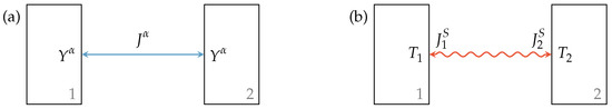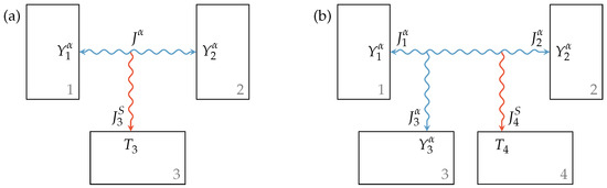 For the Newtonian heat transfer, the generated entropy is typically transferred to the contact point with lower temperature. However, if contact points with extensity type other than entropy are involved in an irreversible interaction, as shown in Figure 2a, an additional entropy reservoir is needed to receive the generated entropy. In this case, the extensity flux is conserved: