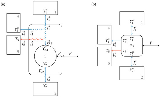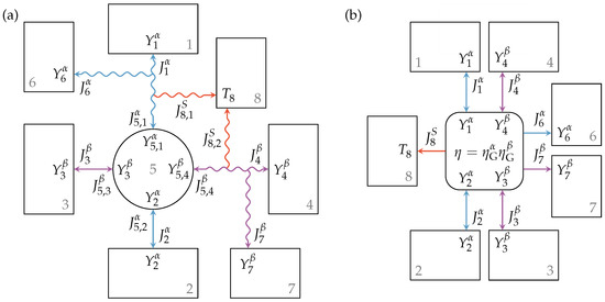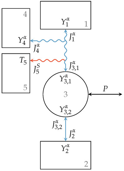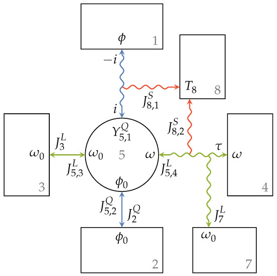 where , , , and are the fluxes entering or leaving Engine 5 at the contact points towards Reservoirs 1 to 4, respectively, and and are the fluxes into or out of Reservoirs 2 and 3, respectively. The relations of the extensity fluxes of the lossy interactions are given by: