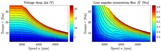 In our example, and are given as functions of the torque output and the engine speed. Using the above equations, we can thus easily determine the unknown voltage drop , as well as the occurring loss flux of torque as shown in Figure 7. An interesting effect that can be seen here is that mainly increases with output torque and has the highest values at around 2000 rpm, while seems to increase with the product of torque output and engine speed.