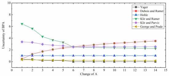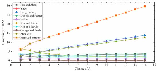 The number of elements in the proposition A changes from 1 to 14. To verify the advantages of the improved belief entropy, another eight uncertainty measures are introduced for comparison: Deng entropy [], Höhle’s confusion measure [], Yager’s dissonance measure [], Dubois and Prade’s weighted Hartley entropy [], Klir and Ramer’s discord measure [], Klir and Parviz’s strife measure [], George and Pal’s conflict measure [], Pan and Zhou’s measure [] and Zhou et al.’s measure [].