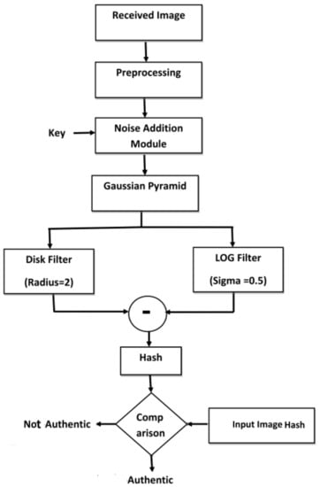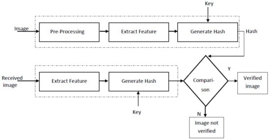 The hash verification module shown in Figure 7 is used to verify the authenticity of the received image, .