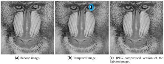 To explain the first two points, consider the Baboon image shown in Figure 2a and its tampered version in Figure 2b. Tampering is done by changing the area around the right eye ball. This is an example of malicious distortion or tampering. An effective image hashing scheme should detect this tampering as it has changed the content of the image. To show an example of non-malicious distortion, consider the JPEG compressed version of the Baboon image shown in Figure 2c. In this case, the content of the image is same, however the pixel values would be different. An ideal image hash function should generate similar hash value for images shown in Figure 2a,c as they have similar content. Practical image hash functions however would generate difference hash values. The difference in hash values should be considerably small. A threshold is used to distinguish malicious and non-malicious distortions. Choosing a suitable threshold is still a research challenge in image hashing and is also discussed in this paper.
