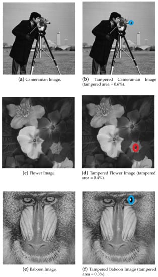 To check the tamper detection capability of the proposed scheme, the Einstein image, Cameraman image, Flower image, Joker image, Girl and Baboon images were considered as test images. Three test images and their tampered versions are shown in Figure 8. It is important to mention that for all the tampered images under consideration, the tampered area is less than 1% of the total area of the respective original image. The tampered area considered in this paper is small when compared with other papers, for example, [28]. Hashes of original images and their respective tampered versions were calculated and the difference matrix is calculated to obtain . The result of is tabulated in Table 1. This result reveals that if the value of threshold is kept at 20, then all the tampered cases would be successfully detected.