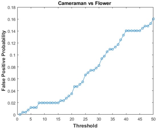 In order to calculate FPP, hash of the Flower image was compared with hash of the Cameraman image. These two images were chosen as they are perceptually different. By changing the value of threshold , positively authenticated image blocks were observed and FPP was calculated using Equation (14). The graph of FPP versus threshold is shown in Figure 9. The value of FPP increases with the increase in threshold (). At = 20, the value of FPP is 0.03, which is good.