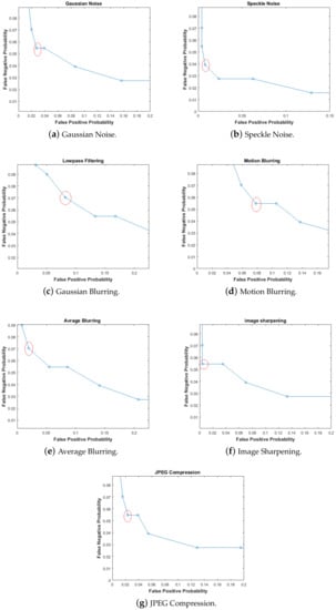 After FPP and FNP estimation, finding the ROC curves becomes easy. The ROC curve for the proposed system is plotted by taking FPP on the x-axis and FNP on the y-axis. It is required that either both FPP and FNP be small enough to be negligible or at least FPP should be very small if not possibly zero. Both the probabilities have an inverse relationship. The ROC curve gives an idea about the selection of a suitable threshold by selecting minimum values of FPP and FNP. The ROC curves for different non-malicious distortions are shown in Figure 10. The values of FPP and FNP are tabulated in Table 4. These results reveal that the proposed scheme has low FNN at low FNP.