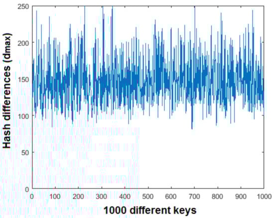 To check sensitivity of the secret key, an experiment was performed in which 1000 different keys were used on the Baboon image. The result of this experiment is shown in Figure 11 depicting the maximum and minimum change in the value of , which is 264 to 81, respectively. This demonstrates that the proposed hashing scheme is very sensitive to change in the secret key. The key space of an algorithm is the set of all possible keys. In a good cryptosystem, the key space must be large enough to resist cryptographic attacks. For the TD-ERCS and Skew tent maps outlined in Section 3, one can see that the key size is dependent on 6 different initial conditions. For a computational precision of around , the key space is which is approximately equal to . This key space is high enough to resist brute force attacks and is comparable to state-of-the-art text hashing schemes, for example, [30,31].