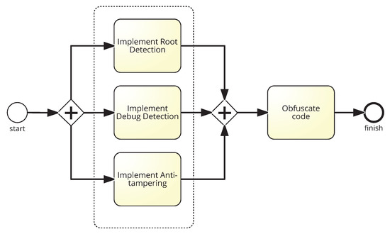 The proposed process (In BPMN, the +−symbol indicates parallel execution of tasks) is shown in Figure 3, which presents the measures that have to be taken to protect an app from SSL pinning bypassing. In the implementation phase of the app, root detection, debug detection and anti-tampering measures must be implemented. Finally, the code must also be obfuscated. All these security measures should be applied to guarantee that SSL pinning is not bypassed. They are described in detail below.