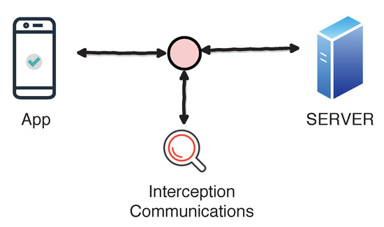 It is important to remark that neither the app client nor the server is attacked. Communications are the objective. The attacker could install the app in his/her device, decompile the app, modify the app, compile it again and sign it with his/her own certificate. The server does not verify the new certificate, but the app. The attacker could intercept communications, see how communications are implemented and tamper the app. Thus, the integrity of the information is compromised. Figure 5 represents the threat scenario.