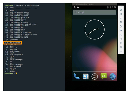 - It should be confirmed that the daemon server is running and has enough permissions to read and manipulate the memory of the device. With this aim, Frida framework can be used by means of the following command:Figure 6 shows how a Frida server is running in a mobile emulator.