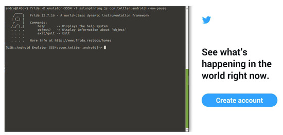 - It must be checked that there are not any restrictions that prevent the SSL handshake of the connection. If so, the connection is established. Finally, it must be confirmed that the target app works properly and SSL pinning was disabled. Figure 7 shows an example of how the execution of the Twitter app is intercepted by Frida.