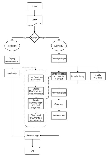 As a new contribution, we propose two new methods to bypass SSL/TLS validations in Android devices. The first method deals with rooted devices and the second one deals with non-rooted devices. Since the new methods were compared with the ones defined in Section 4.2, we decided to number the new methods as Methods 6 and 7, respectively. Methods 6 and 7 makes circumventing SSL pinning in debug mode possible.