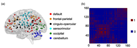 (a) One hundred and sixty regions of interest (ROIs) are shown on a surface rendering of the brain. ROIs in different functional networks are shown in different colors. (b) The adjacent matrix A of 160 ROIs in 6 functional networks.