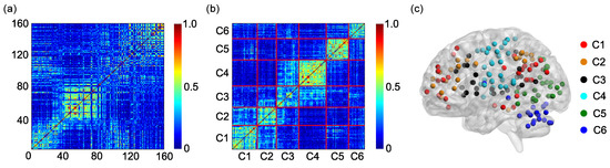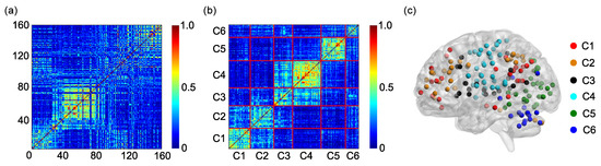 The element represents the SampEn of dynamic FC between the ith ROI and jth ROI equals 0 The matrix E is used to cluster the 160 ROIs into 6 clusters.