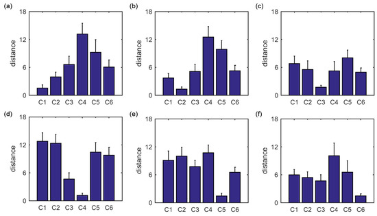 The average of the squared Euclidean distances from all ROIs in each of the six clusters to the centroid of cluster is also evaluated, as shown in Figure 4a–f. For each centroid, among the six averaged distances, the averaged distance from the cluster to the centroid of cluster i is the lowest. This is consistent with the main idea of the K-means clustering algorithm.
