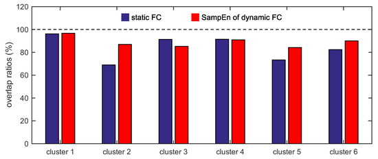 For the two different measurements (the static FC and the SampEn of dynamic FC), the overlap ratios between cluster 1 and the default network, cluster 2 and the frontal-parietal network, cluster 3 and the cingulo-opercular network, cluster 4 and the sensorimotor network, cluster 5 and the occipital network, and cluster 6 and the cerebellum network are shown in Figure 8. For cluster 3, the overlap ratio corresponding to the static FC (91.30%) is larger than that corresponding to the SampEn of dynamic FC (85.19%). For cluster 4, the overlap ratio corresponding to the static FC (91.43%) is slightly larger than that corresponding to the SampEn of dynamic FC (90.91%). For the other four clusters (clusters 1, 2, 5, and 6), the overlap ratios corresponding to the SampEn of dynamic FC are larger than that corresponding to the static FC. For clusters 1, 2, 5, and 6, the overlap ratios corresponding to the SampEn of dynamic FC are 96.67%, 86.96%, 81.48%, and 90.00%, whereas the overlap ratios corresponding to the static FC are 96.15%, 68.97%, 73.33%, and 82.35%.