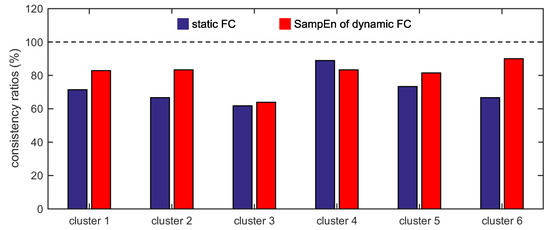 For the two different measurements, the consistency ratios between cluster 1 and the default network, cluster 2 and the frontal-parietal network, cluster 3 and the cingulo-opercular network, cluster 4 and the sensorimotor network, cluster 5 and the occipital network, and cluster 6 and the cerebellum network are shown in Figure 9. For cluster 4, the consistency ratio corresponding to the static FC (88.89%) is larger than that corresponding to the SampEn of dynamic FC (83.33%). For the other five clusters, the consistency ratios corresponding to the SampEn of dynamic FC are larger than that corresponding to the static FC. For clusters 1, 2, 3, 5, and 6, the consistency ratios corresponding to the SampEn of dynamic FC are 82.86%, 83.33%, 63.89%, 81.48%, and 90.00%, whereas the consistency ratios corresponding to the static FC are 71.43%, 66.67%, 61.76%, 73.33%, and 66.67%.