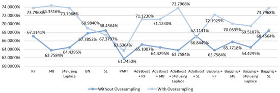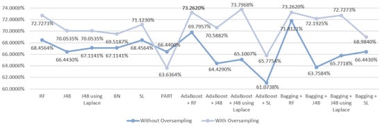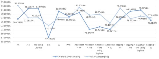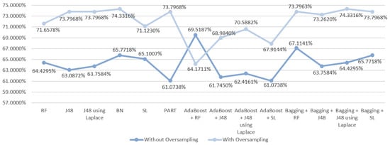 In the third scenario, the results that were obtained from the execution of the selected models showed that initially the best result was obtained by the ensemble technique Boosting with SL resulting in an accuracy of 69.7987%. Observing the Figure 5, it is notable that the use of oversampling improved the results obtained in 13/14 of the tested DM techniques, just like in S1, but this time the exception was the SL algorithm. Thus, the best accuracy value for this scenario was 73.2620%, obtained using the ensemble technique Bagging with J48 using Laplace correction.