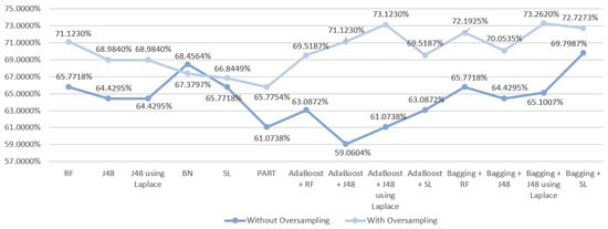 Regarding the first scenario, a first analysis of the results (Figure 3) revealed that the use of oversampling improved them in 13/14 of the tested DM techniques, as it only worsened with the PART algorithm. Without the use of oversampling, SL produced the best result, which despite presenting the same accuracy as the RF model (68.4564%) showed better results for the other metrics in comparison with RF. The best result for this scenario was obtained using oversampling by the ensemble technique Boosting with J48 using Laplace correction, achieving an accuracy of 73.7968%.