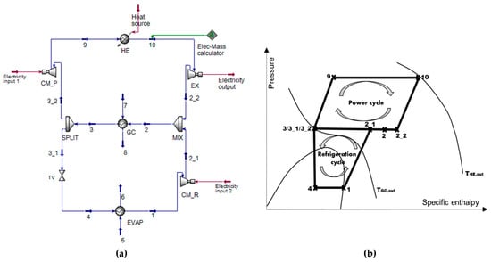Figure 1 presents the schematic of a transcritical heat-driven compression refrigeration system with R744 inspired by Chistiakov and Plotnikov []. The system coupled a closed power cycle (Brayton cycle) with a transcritical refrigeration cycle. It consists of nine components: an evaporator (EVAP), a compressor for refrigeration cycle (CM_R), a mixer (MIX), a gas cooler (GC), a splitter (SPLIT), a throttling valve (TV), a compressor for power cycle (CM_P) as well as a heater (HE) and an expander (EX).
