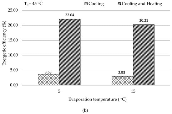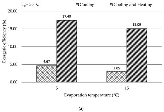 In this study, the performance of a transcritical heat-driven refrigeration system with R744 as the working fluid for both subsystems was investigated. Four scenarios focusing on air conditioning applications (TEVAP = 5 and 15 °C) under hot climatic conditions (T0 = 35 and 45 °C) were simulated, optimized, and compared. Table 6 demonstrates the exergetic optimization results aiming at the highest exegetic efficiency of the overall system for each scenario.