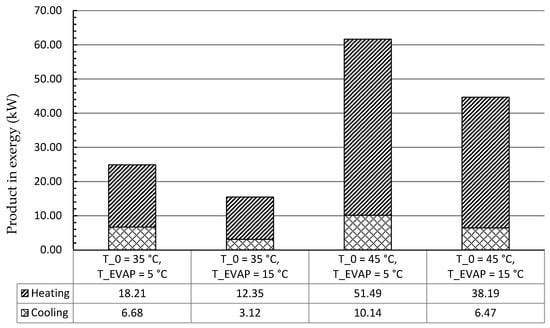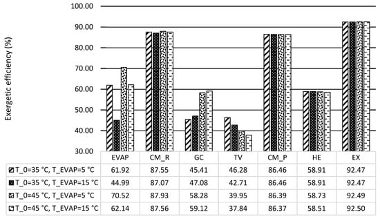 In addition to energy analysis, the exergetic evaluation was conducted based on the exergy of fuel/exergy of product approach (for the kth component and the overall system) to identify the location and the magnitude of the irreversibilities []. The exergetic efficiency is expressed as the ration of exergy of product () and exergy of fuel ():