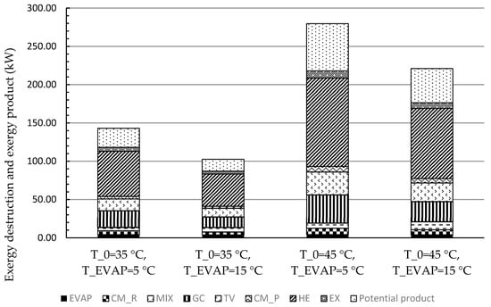 The simulations were carried out by Aspen HYSYS® Software (AspenTech, Bedford, MA, USA). Moreover, the exergy-based method was applied for optimizing, comparing, and investigating the system under various operation conditions. The Span–Wagner equation of state was selected for calculating the thermodynamic properties of CO2 since it is one of the most accurate models to predict CO2 behaviors in a wide range of temperature and pressure, including a high temperature, at high pressure and in the vicinity of its critical point []. To conduct the exergy-based method, the reference temperature T0 varies when the assumption of the ambient temperature varies (T0 = 35/45 °C), while the reference pressure p0 in this study keeps constant (p0 = 1.013 bar).