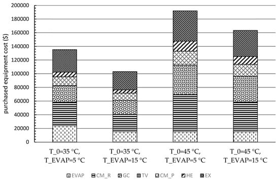 Moreover, the power consumption was used as the capacity X for estimating the cost of the compressor, while, for the evaporator, X refers to the heat-transfer area of the heat exchanger. For calculating the heat-transfer area of the evaporator, the overall heat-transfer coefficient was set to 950 W/(m2K) []. In Table 5, the values used for the cost estimation of the compressor and evaporator are listed.