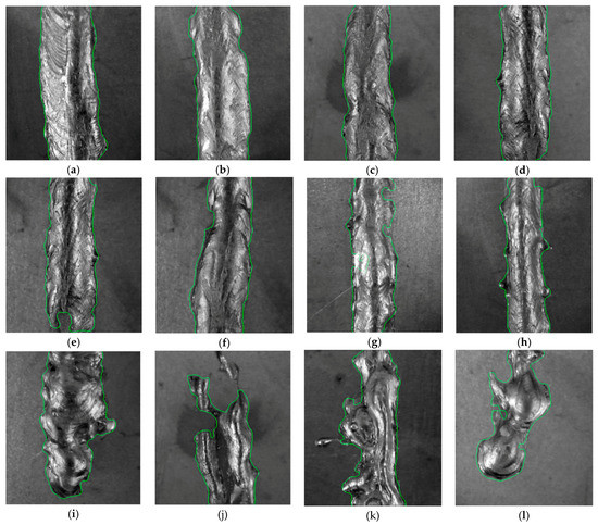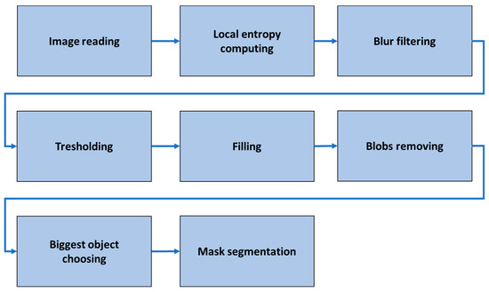 The sample images depict the weld itself and the background—metal sheet. The background does not affect the evaluation of the weld and is masked from the images by the proposed algorithm. The simplified flowchart of the algorithm is shown in Figure 3.