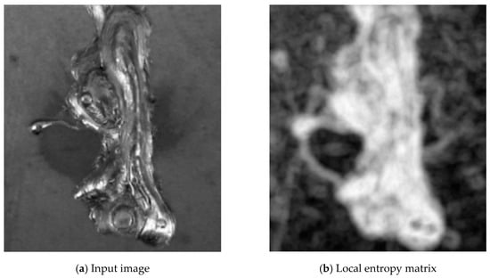 This value contains information about the complexity/unevenness around the pixel. The neighbourhood radius was set to 8 pixels. To compute the entropy, the filters.rank.entropy function from the Python library scikit-image was used. The resulting local entropy matrix effectively finds the edges and texture complexity in the image. The results of filtering can be seen in Figure 4.
