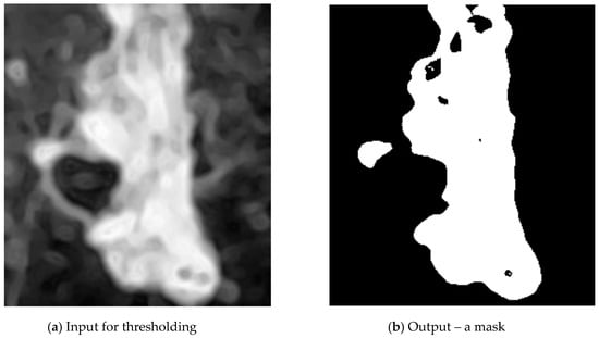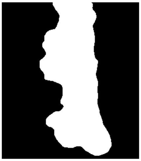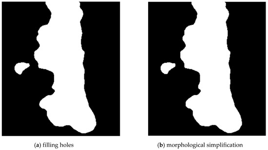 The thresholding result may have some imperfections—small blobs and unfilled areas. Unfilled areas are removed using the inverted output of the function bucketfill (imager library). It is applied on the background of the weld and it finds all pixels of the background. The remaining the pixels are filled with value 1 (white) (Figure 7a).
