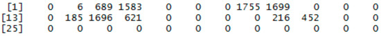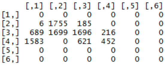 The function ceiling rounds a number to the next higher integer. Using division of the index by the size of the subfield, and subsequently the function ceiling, we obtained for the selected index . The function as.vector retypes the resulting two-dimensional array into a vector by writing the matrix elements column-wise into a vector. Example of retyping can be understood from Figure 10 and Figure 11.