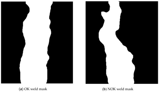 The representation in the form of polar coordinates for the OK weld visibly differs from the NOK one. The big jumps and variations on the graph are caused by large irregularities in the weld shape. The advantage of such representation is that it can be used for any input mask resolution. The disadvantage is a complicated calculation. Generally, mask representations contain information only about the shape of the weld, which can be considered as a disadvantage because texture information is important input data for the neural network.