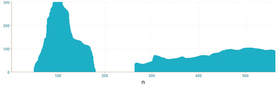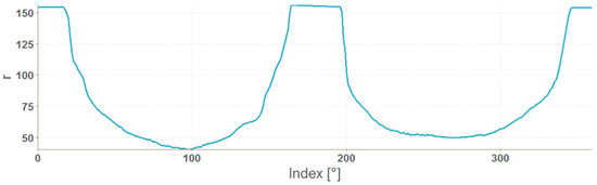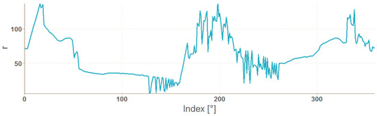 If the resulting number of coordinates is less than 360, the missing angle values are completed and the corresponding distances are calculated from the surrounding values by linear interpolation using the na_approx function (zoo library). The result is a vector with 360 elements, which indices correspond to the angle values in degrees, and the value is the distance r. The resulting graphs of OK and NOK weld masks (Figure 17) are in Figure 18 and Figure 19.
