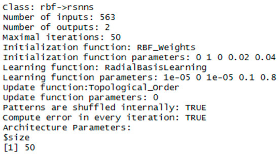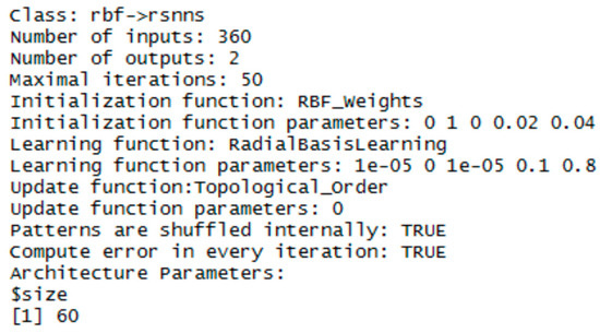To implement the RBF network, the RSNNS library was chosen (just in this one the RBF network template is available). Three RBF networks were configured using the function rbf (RSNN library). The set parameters were the number of units in the hidden layer and the number of epochs, the initial parameters had default values. The best configurations were chosen experimentally. Configuration details are in Figure 20, Figure 21 and Figure 22.