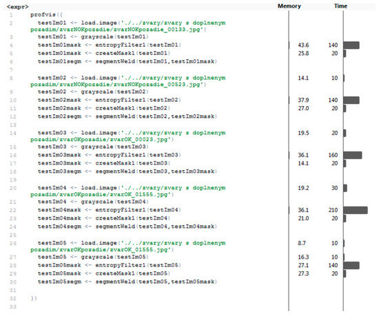 Segmentation was performed by concatenating the outputs from functions load.image, grayscale, entropyFilter, createMask, and segmentWeld. Almost all functions in this section of the program were performed very quickly (within 30 ms) except for the entropyFilter function, which took an average of 158 ms to be completed. This function is the most important part of the segmentation algorithm; the time was acceptable. The average time to complete the whole segmentation was 194 ms. The average amount of memory allocated was 74.76 MB. For MLP and RBF networks, the next step was to transform masks into feature vectors. The profiling results of functions performing three types of transformations can be seen in Figure 33.