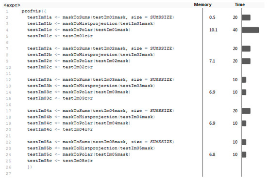 The results show that these functions are optimal, taking up minimal memory and time. The mean values for computing the vector of sums of subfields in the mask are 16 ms and 0.1 MB; for the histogram projection vector, it is less than 10 ms and less than 0.1 MB (estimation of profiling tool, real values are immeasurably small). Values for the polar coordinates vector are 18 ms and 7.56 MB. Presented results are also shown in Table 2.