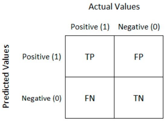 As the main criterion for results evaluation the confusion matrix was chosen. The main diagonal of the confusion matrix contains the numbers of correctly classified samples, the antidiagonal contains the numbers of incorrectly classified samples; the smaller values in the antidiagonal, the more successful the prediction model. In a binary classification this matrix contains four values (Figure 34): TP—true positive; FP—false positive; FN—false negative; TN—true negative.