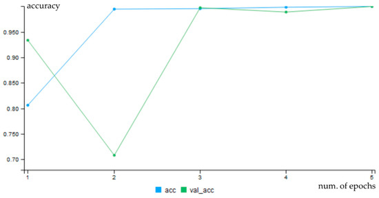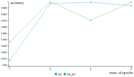 For convolution networks, changes of accuracy after each epoch for both training (blue line) and validation data (green line) are shown in Figure 39. The charts show that training with non-segmented weld images started at a lower accuracy and the learning was slower (Figure 40).