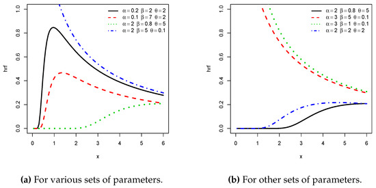 (another parameter of the former definition of the inverse Lomax distribution has been reduced to 1 for the purposes of the paper). Let us now briefly motivate this choice. As suggested by its name, the inverse Lomax distribution is the distribution of the random variable , where X denotes a random variable following the standard Lomax distribution (with parameters and 1). The corresponding pdf and hrf are, respectively, given by